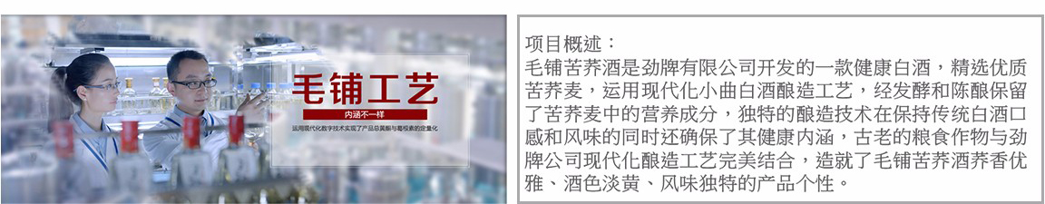 毛鋪苦蕎酒是繼勁牌大團(tuán)圓酒后勁牌有限公司開發(fā)的一款健康白酒,精選優(yōu)質(zhì)苦蕎麥,運(yùn)用現(xiàn)代化小曲白酒釀造工藝,經(jīng)發(fā)酵和陳釀保留了苦蕎麥中的營(yíng)養(yǎng)成分,獨(dú)特的釀造技術(shù)在保持傳統(tǒng)白酒口感和風(fēng)味的同時(shí)還確保了其健康內(nèi)涵,是勁牌進(jìn)軍健康白酒的一款重量級(jí)產(chǎn)品,2016年正式進(jìn)入西南市場(chǎng),2017年毛鋪苦蕎酒成功入選CCTV國(guó)家品牌計(jì)劃。